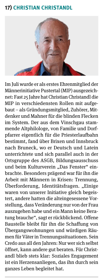 In der Pustertaler Zeitung: Die Menschen des Jahres 2025. Darunter Christian Christandl, Ehrenmitglied der MIP.